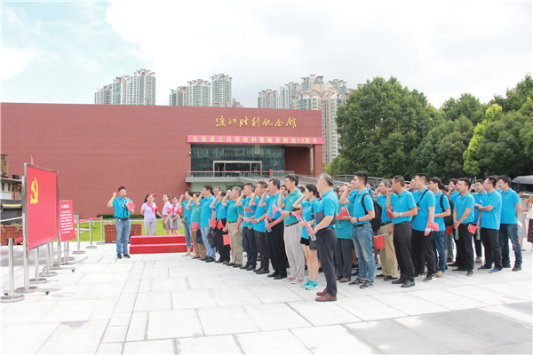 在渡江胜利纪念馆前广场,全体党员举起右拳面向鲜红的中国共产党党旗肃穆站立,一起重温入党誓词,用铿锵有力、掷地有声的誓言表达不忘初心、砥砺担当的坚定信念。