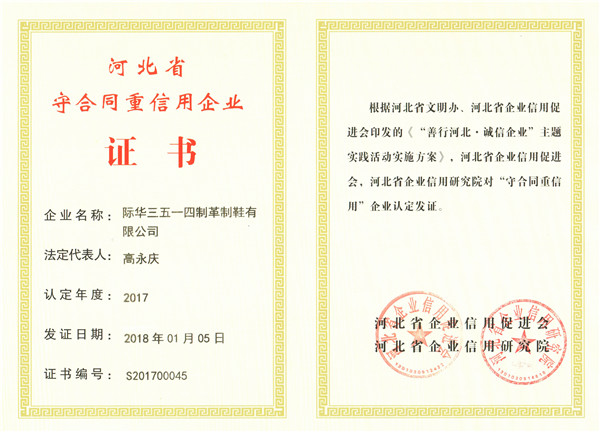 不止于荣誉,这更是一份责任和使命。今后3514公司将继续发扬诚信经营的示范带头作用,建立健全守合同重信用的长效机制,不断加强企业诚信品牌建设、树强树优对外信誉形象,进一步引领河北省鞋靴产业技术发展,为推进社会信用体系建设做出积极贡献。