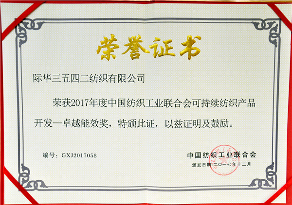 近日,际华三五四二纺织有限公司在能效管理上再结硕果,荣获“2017中国纺织工业联合会可持续纺织产品开发——卓越能效奖”。