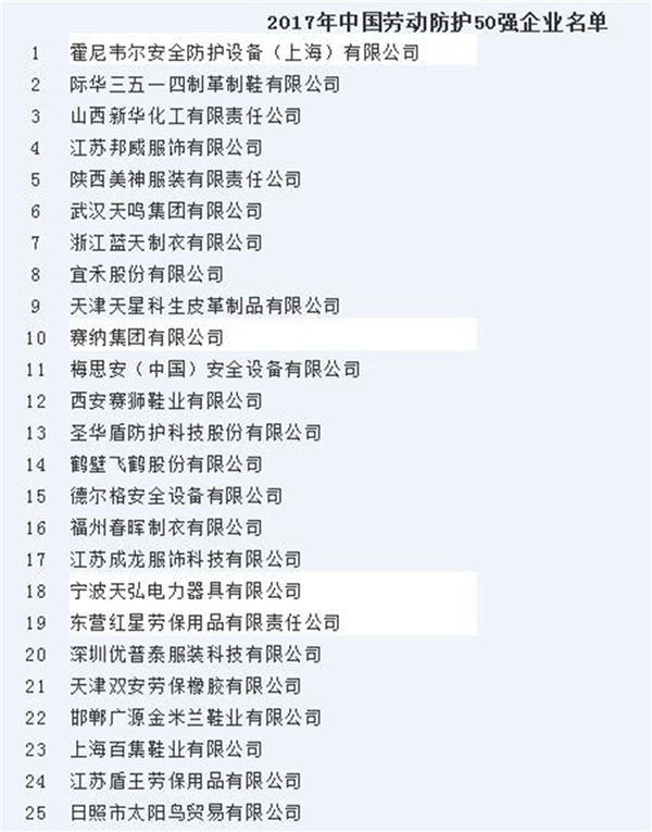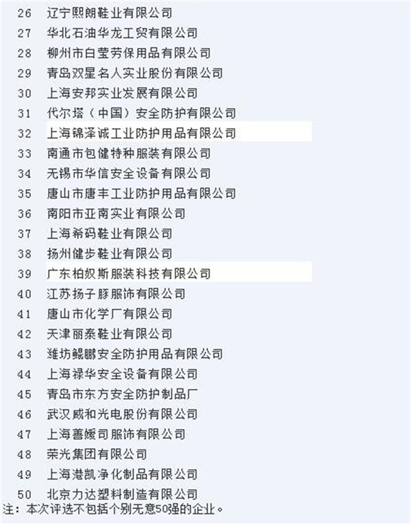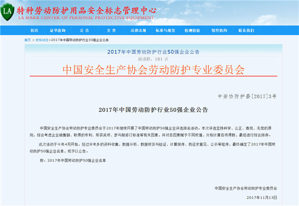中国安全生产协会劳动防护专业委员会为进一步增强劳动防护行业的社会关注程度,培育名优企业和名优产品,2017年开展了“中国劳动防护行业50强企业”评选排名活动。