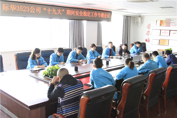 为迎接党的十九大胜利召开,贯彻落实集团公司党委关于营造安全稳定和谐环境的要求,10月11日,际华3523公司党委再次召开了“十九大”期间安全稳定工作专题会议,布置公司安全稳定相关工作,党委书记佟胜利、各党支部书记、支会主席、团支部书记、信访维稳工作人员30余人参会,会议由党委副书记王然主持。