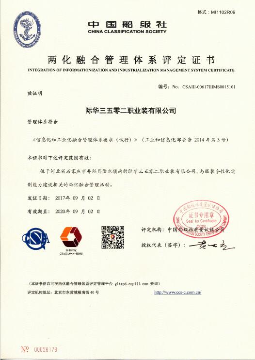 今年7月初,际华3502公司将“两化融合”项目资料提交国家工信部进行审核。经过两个多月的审核评定后,际华3502公司取得了“两化融合管理体系”证书。今后,际华3502公司将不断推进“两化融合管理体系”,在信息化条件下不断提升公司的核心竞争力。