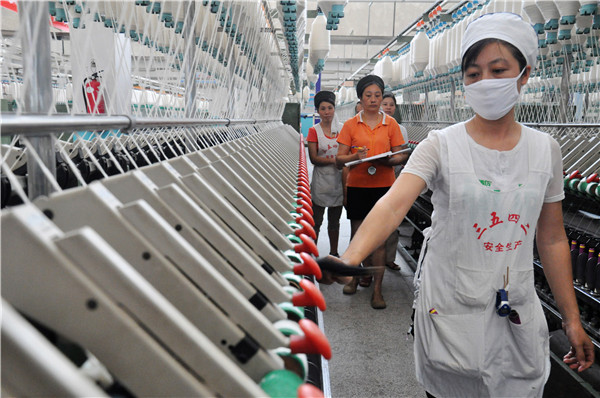 作为2014年“际华杯”职业技能大赛的冠军,吴娟对自己的操作水平心里还是有底的,在每天无数次的自测、互测中,自己在接头速度方面很占优势,但是接头质量不太稳定,偶尔会出现麻花头。“在食指第一关节中部卡头,纱头要挺直,递头要稳。”想起姚技术员不止一次的纠正,吴娟用心地琢磨之后,一遍又一遍的进行纠正,半台车头接下来,吴娟艰难地直起了腰,她用手揉了揉,看到两个小姐妹略显疲惫的身影,走了过去。“来,让我来考考你们。影响产品质量的因素有哪些?什么是纱疵率?”听见姐妹们对理论知识对答如流,吴娟高兴地竖起了大拇指,三朵“金花”相视一笑,三只纤细的手紧紧地握在了一起。